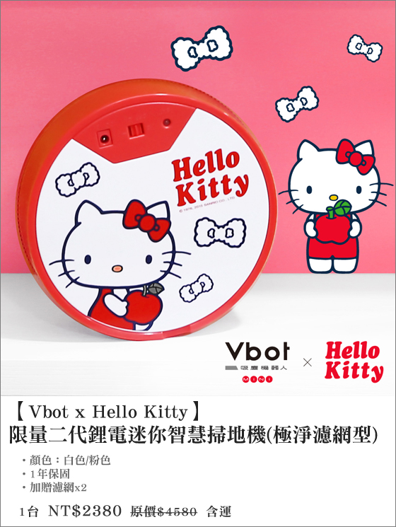 商品訊息簡述: 只要2380元(含運)即可購得【Vbot x Hello Kitty】原價4580元限量二代鋰電迷你智慧掃地機(極淨濾網型)1台,顏色:白色/粉色,購買即加贈濾網x2,並享有1年保固服務!